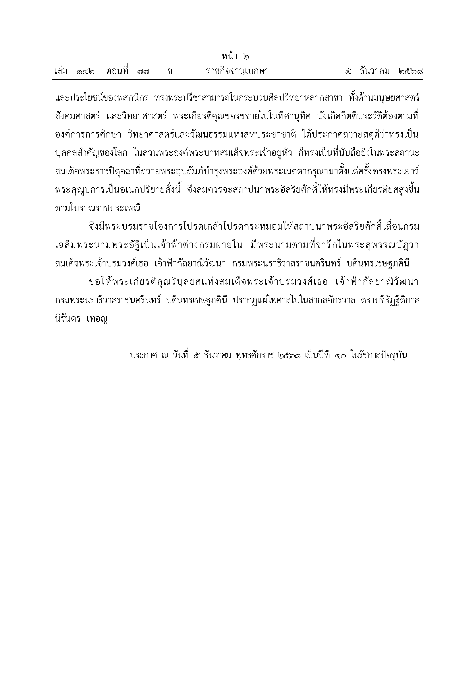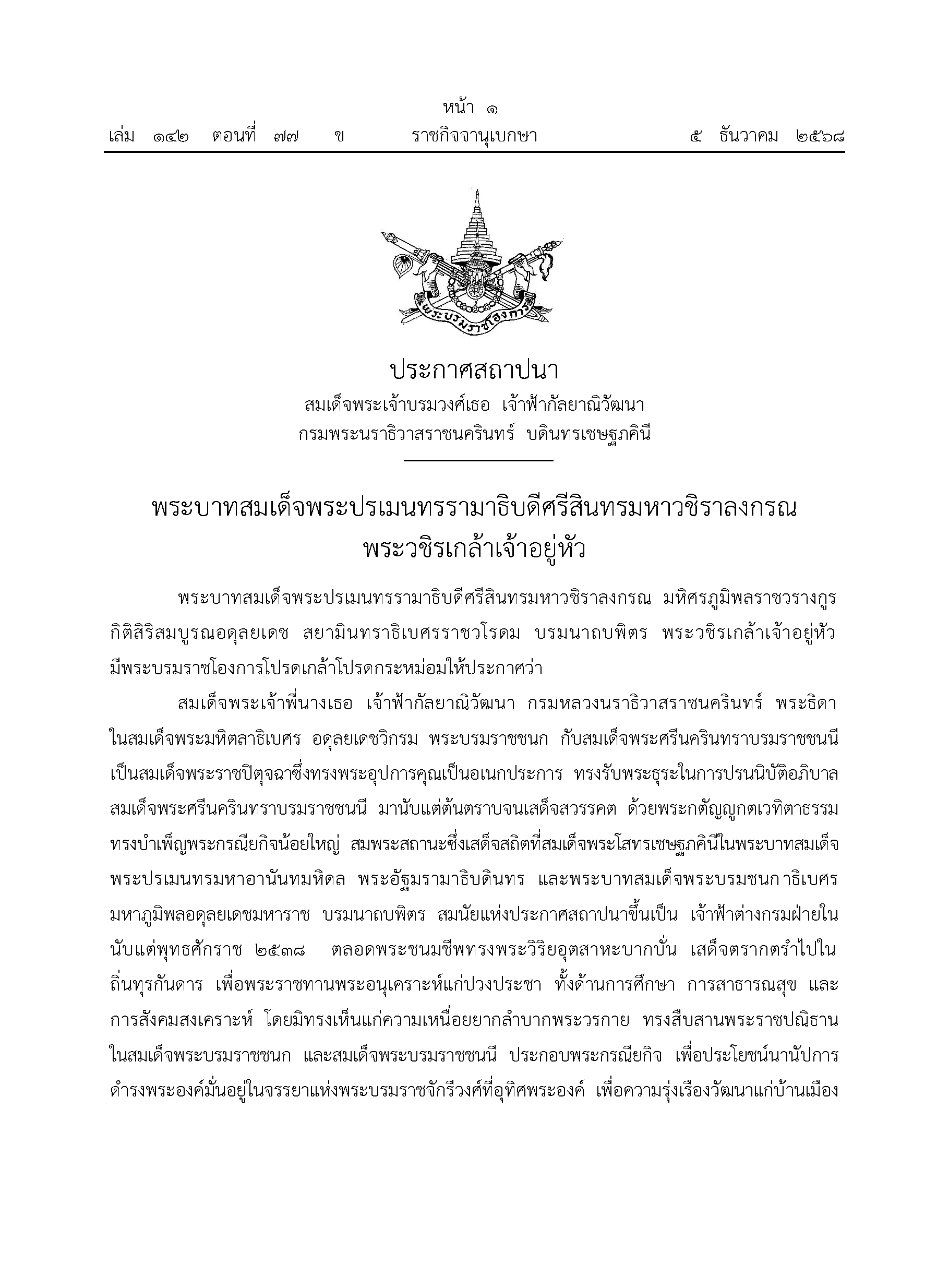 ประกาศในราชกิจจานุเบกษา ลงวันที่ ๕ ธันวาคม พุทธศักราช ๒๕๖๘ ซึ่งได้ประกาศพระบรมราชโองการโปรดเกล้าโปรดกระหม่อม สถาปนาเฉลิมพระนามและพระอิสริยศักดิ์ แด่ สมเด็จพระเจ้าพี่นางเธอ เจ้าฟ้ากัลยาณิวัฒนา กรมหลวงนราธิวาสราชนครินทร์